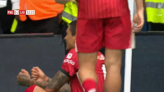 07月13日讯 利物浦vs普雷斯顿第54分钟,努涅斯单刀破门,随后连做两个若塔经典庆祝动作,悼念队友!